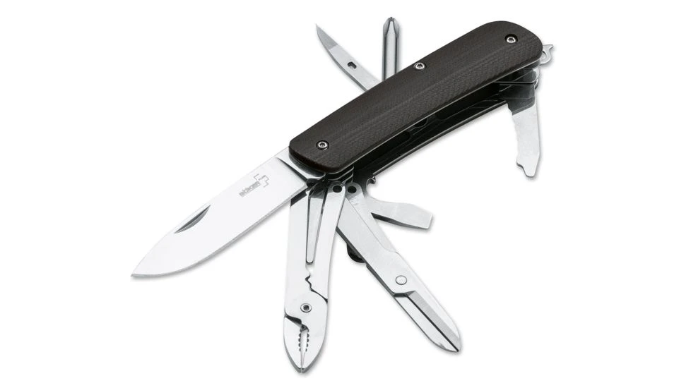 With black G10 handle scales. The hollow ground stainless steel blade made of 12C27 Sandvik is accompanied by these tools (4Cr13): Glass breaker, flat screwdriver with cap lifter and wire stripper, small serrated blade with flat screwdriver, cork screw, lanyard hole, scissors, stitching awl, pliers, wood saw, clip. Open length 6 4/7″. Blade length 2 4/5″. Blade thickness 0.1″. Weight 6.3 oz.![]()