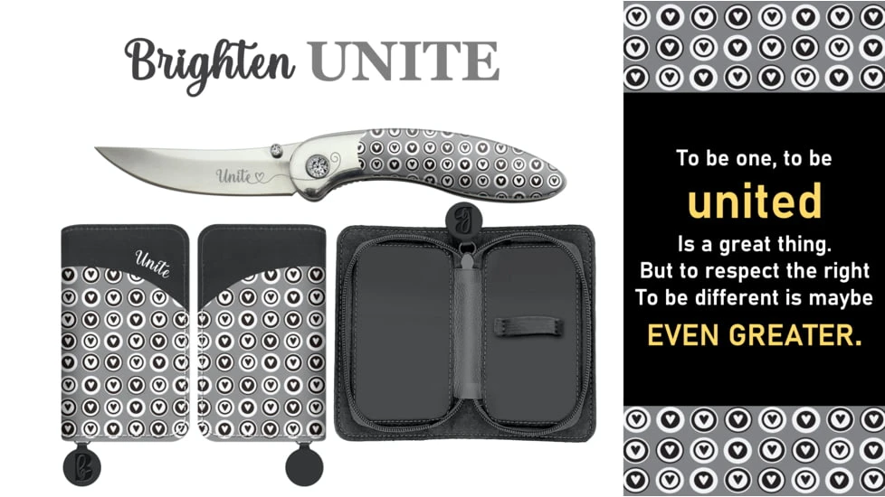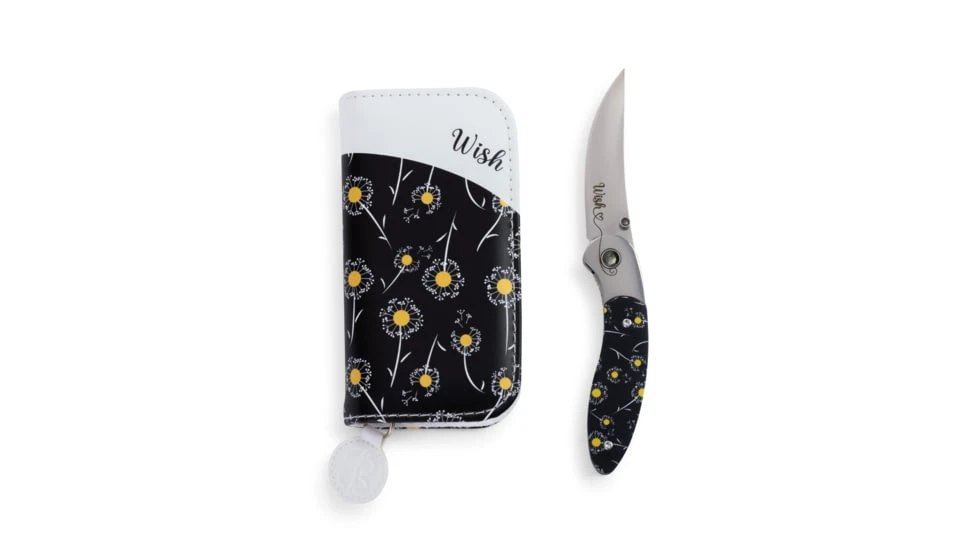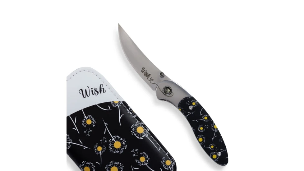 Brighten Blades Wish knife is the perfect everyday carry knife for women. The slim design fits perfectly into a woman’s hand. The jeweled thumb stud makes it easy to open the knife with one hand. Each knife has a positive word engraved on the mirror polished stainless steel blade. The fun colorful pattern on the handle puts a smile on the user’s face. Each knife comes with a zippered case which makes it easy to carry your knife in your purse, glove compartment, backpack, etc.. These knives are perfect to open Amazon boxes, cut off tags, peel an apple, open a package of licorice, all of the many tasks you perform daily. Brighten Blades makes the perfect gift for girls going off to college, for busy moms, and for anyone needing to open packages and boxes. Let Brighten Blades brighten your day!![]()
