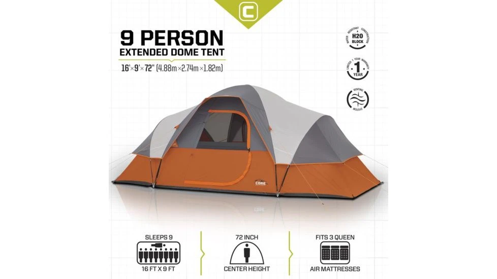 The Core Equipment 9 Person Extended Dome Tent 16ft x 9ft features Core H20 Block Technology- water repellent fabrics with active bead technology for faster water runoff paired with sealed seams and rain-resistant door/window seals. The fully-taped rainfly is removable in warmer weather to expose panoramic mesh windows and ceiling.![]()