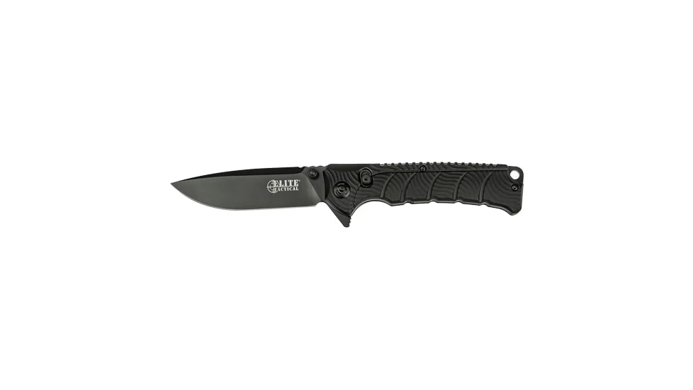Elite Tactical Backdraft. 4.5 inch (11.43cm) closed. 3.5 inch (8.89cm) black finish 8Cr13MoV stainless drop point blade. Black rubberized synthetic handle. Extended tang. Lanyard hole. Thumb stud. Pocket clip. Boxed.![]()