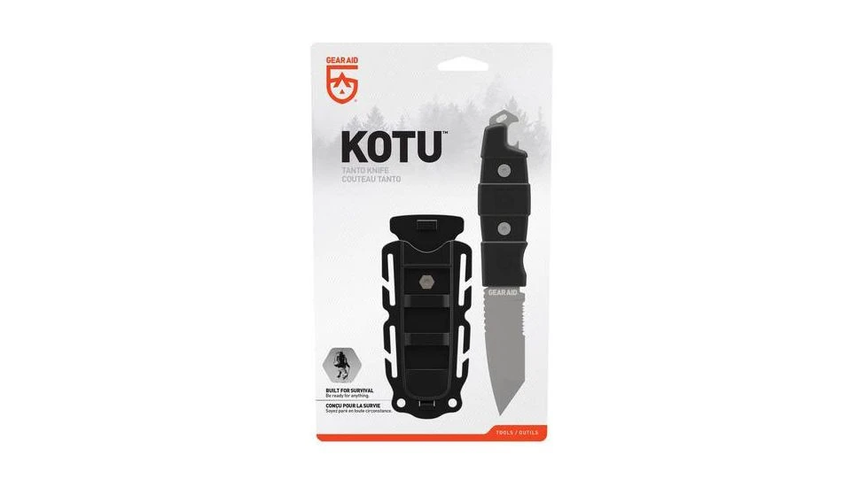 Built for survival, the Kotu Tanto Knife has a fixed blade and sheath that easily mounts to your body or gear for fast access. With a lightweight tactical design, the Kotus tough, full tang blade is also useful on hunting and fishing trips. Whether youre pursuing game or on a field mission, be prepared with the Kotu knife by GEAR AID.![]()