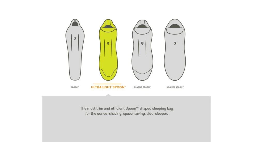 Seventy percent of people sleep on their side, yet mummy bags are not designed to accommodate this. NEMOs unique Spoon shaped bags offer more room at the elbows and knees, allowing side sleepers to shift positions comfortably throughout the night.